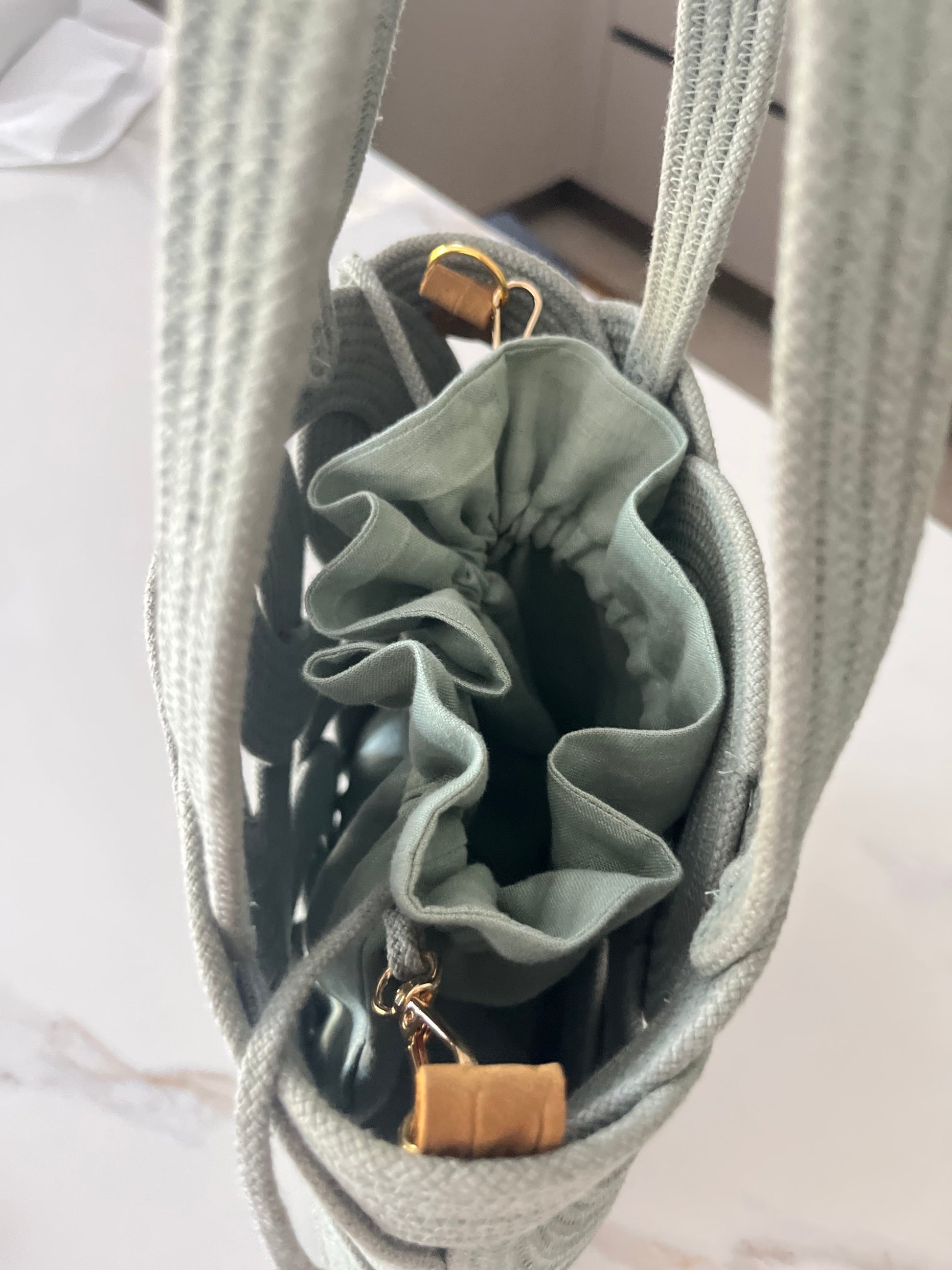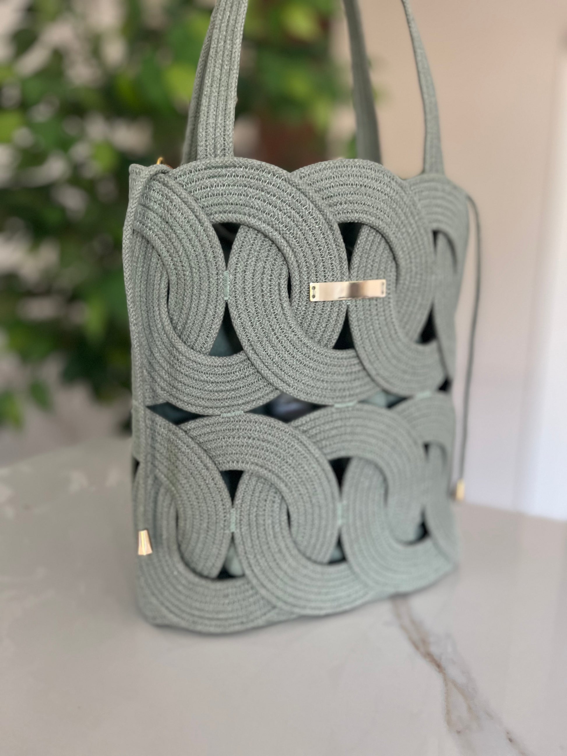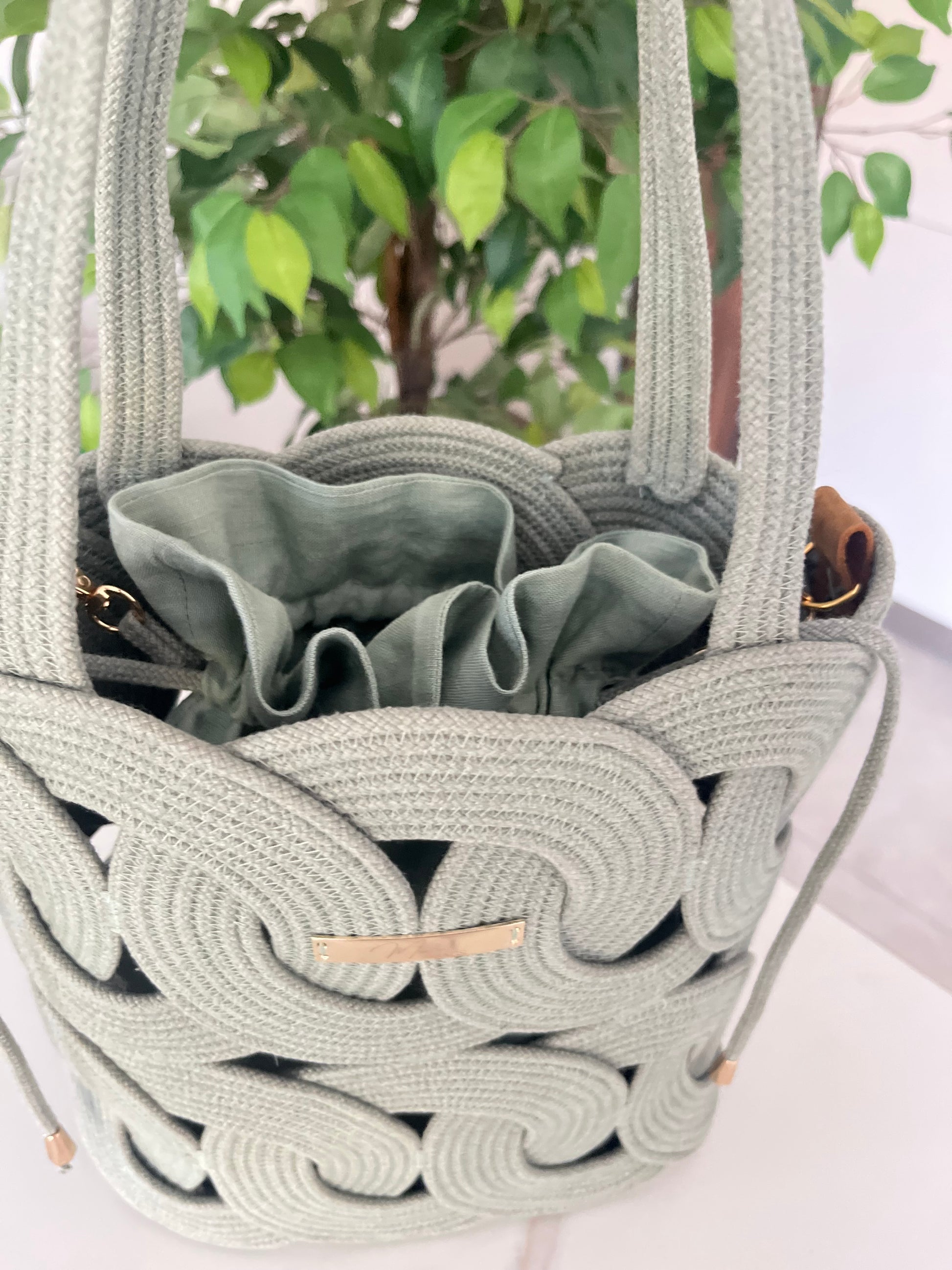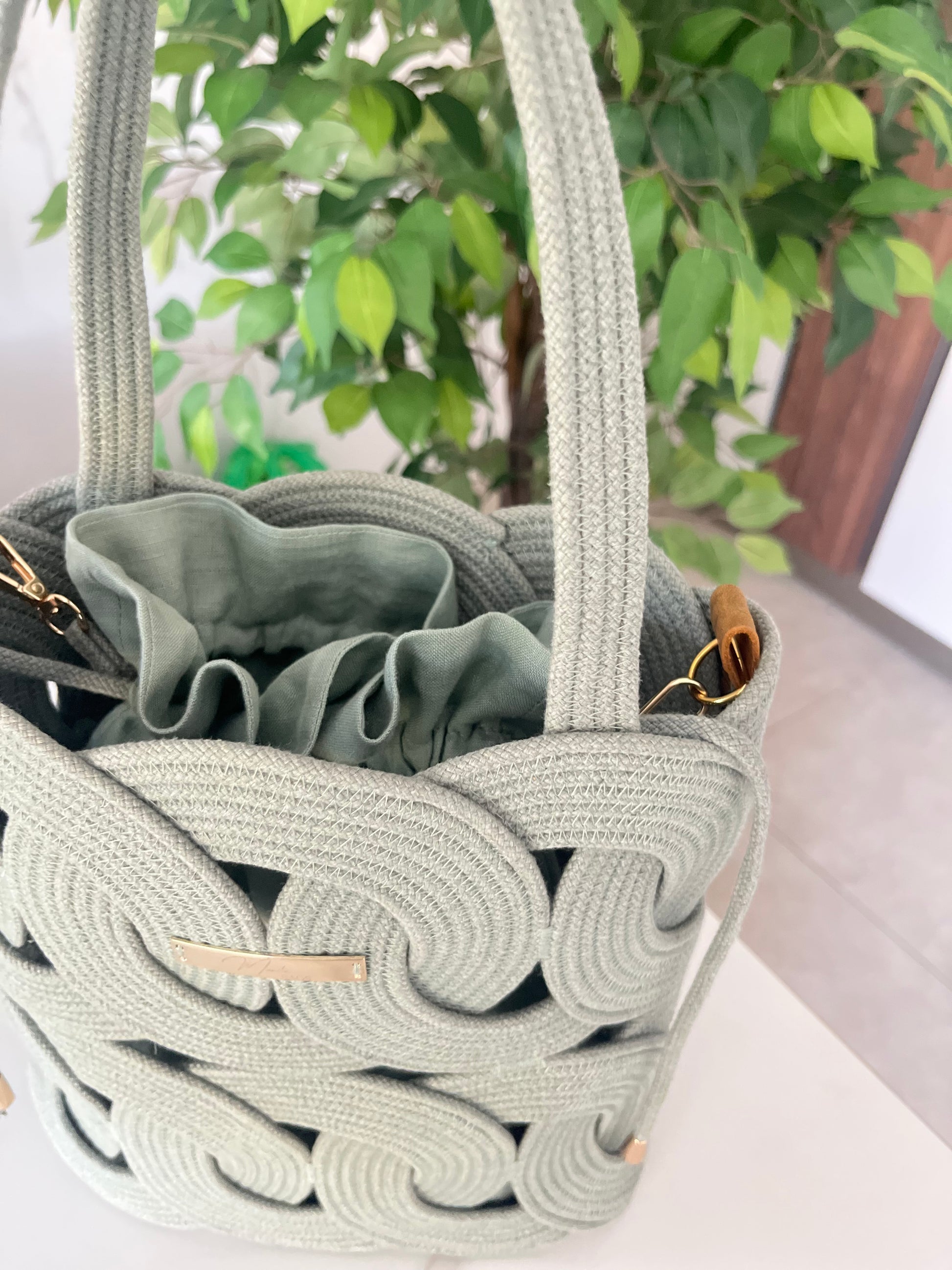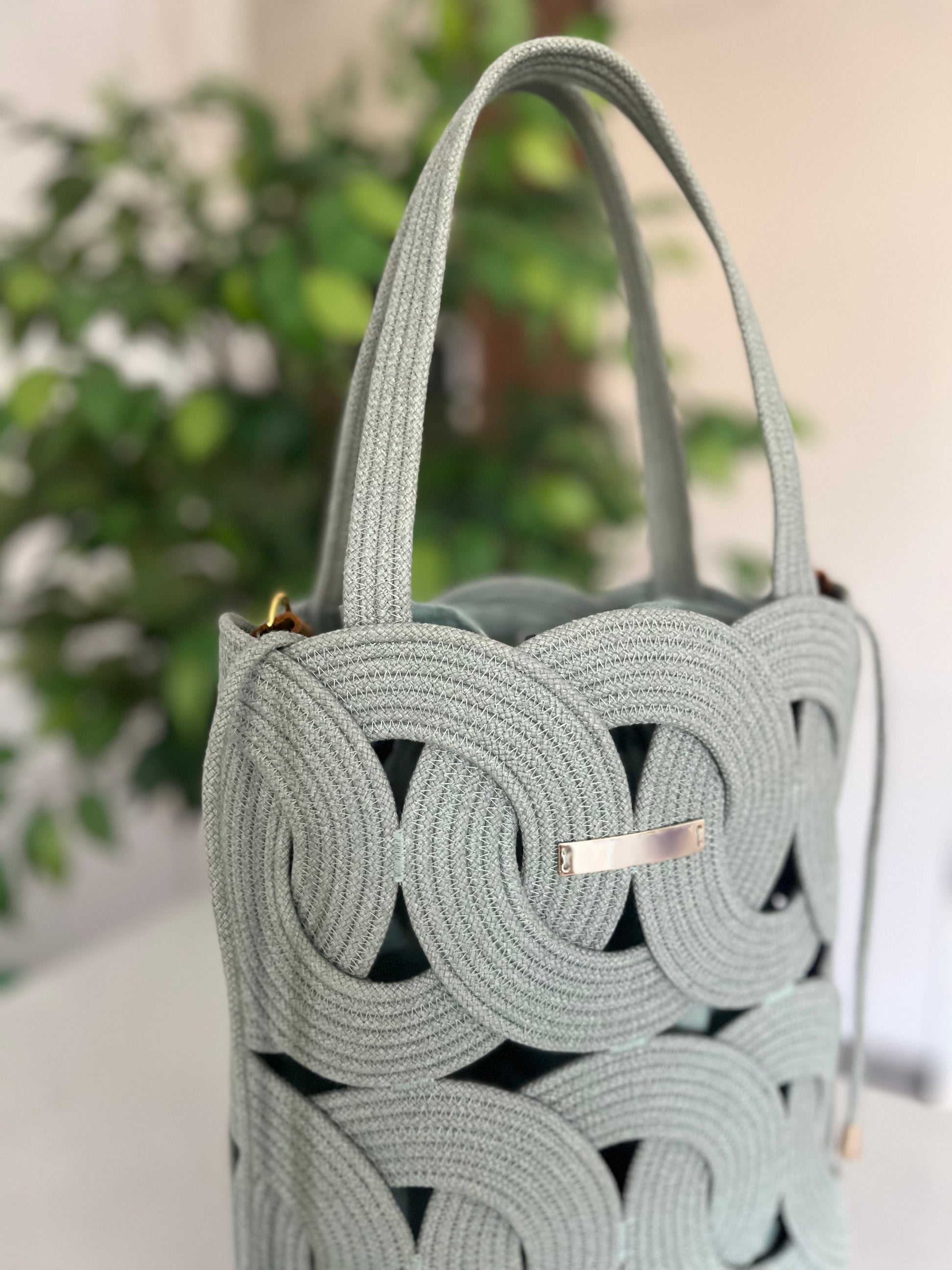 Realizzata a mano in corda di cotone intrecciata, è disponibile con fodera interna o sacchetto in tessuto.