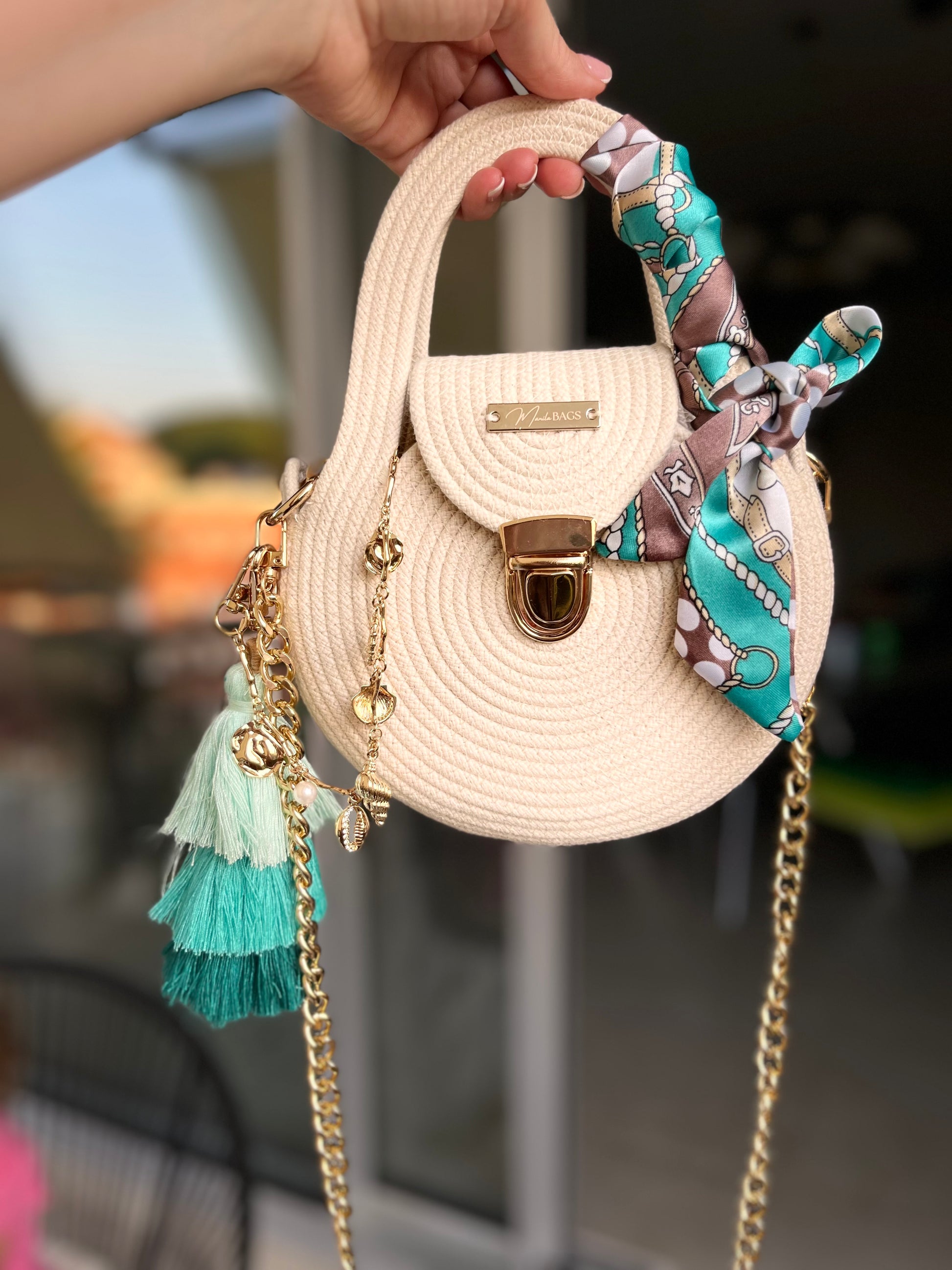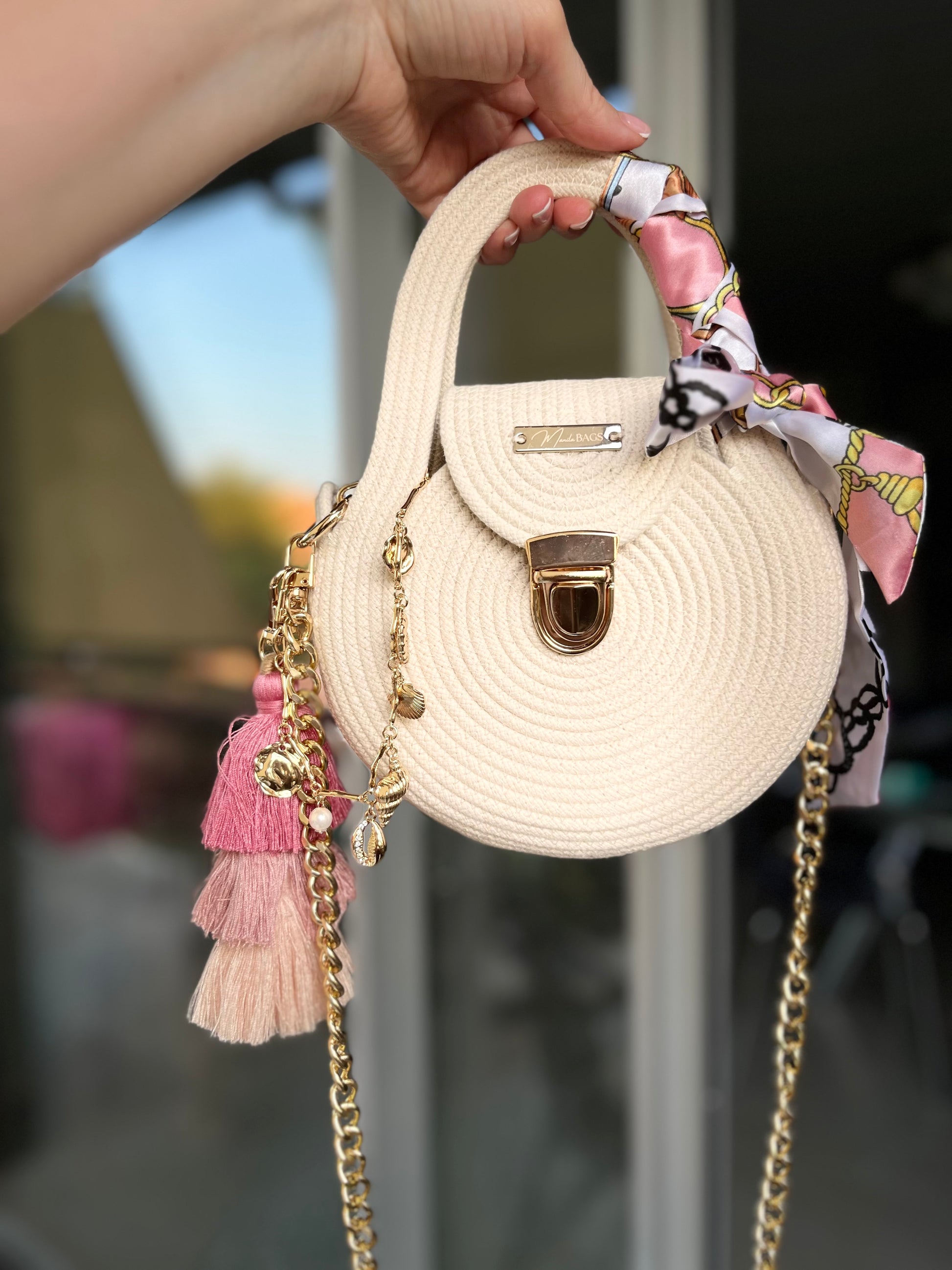 Design tondo e compatto, da indossare con tracolla in corda per un look boho-chic, o con catena dorata per un tocco sofisticato.