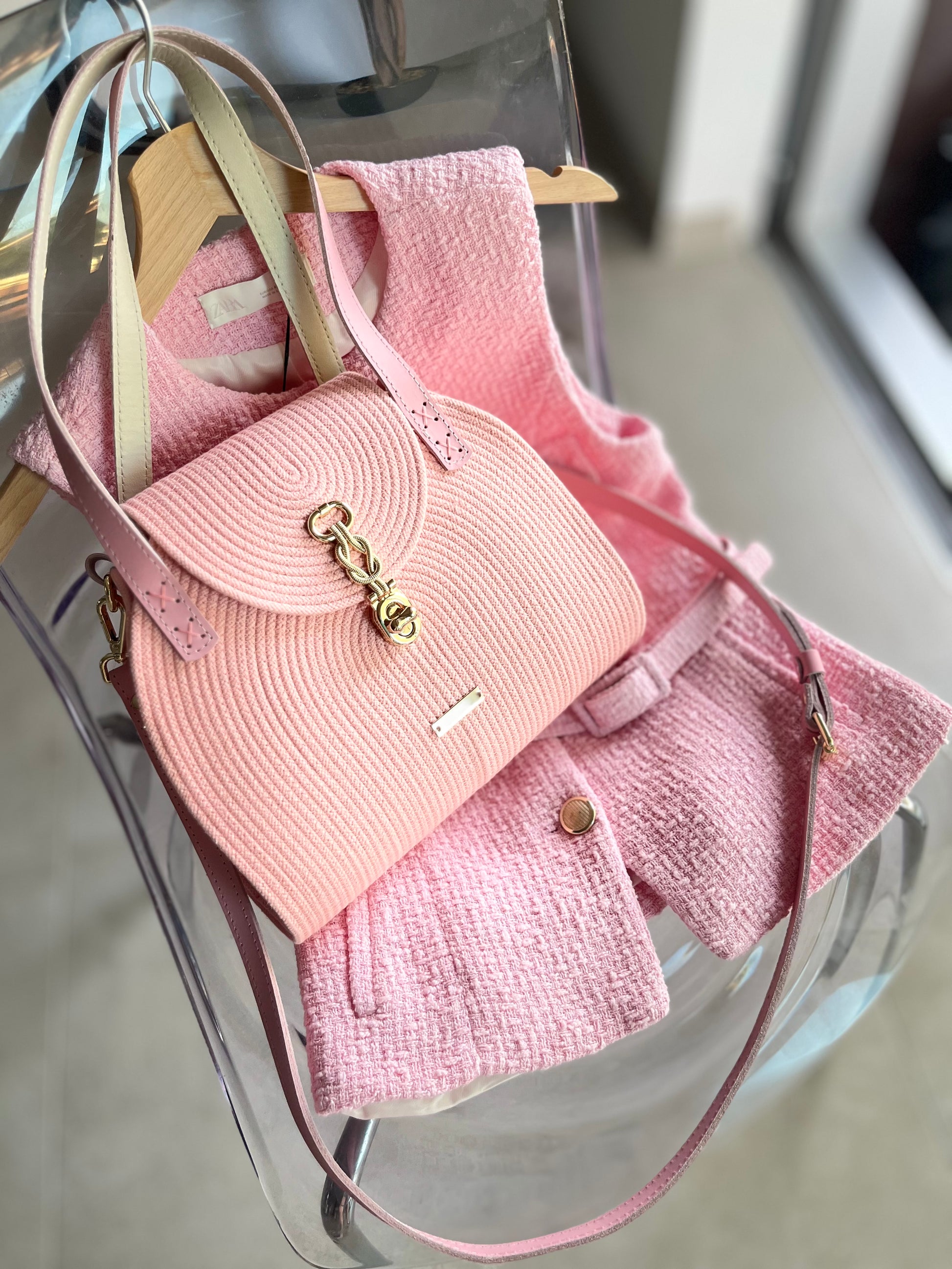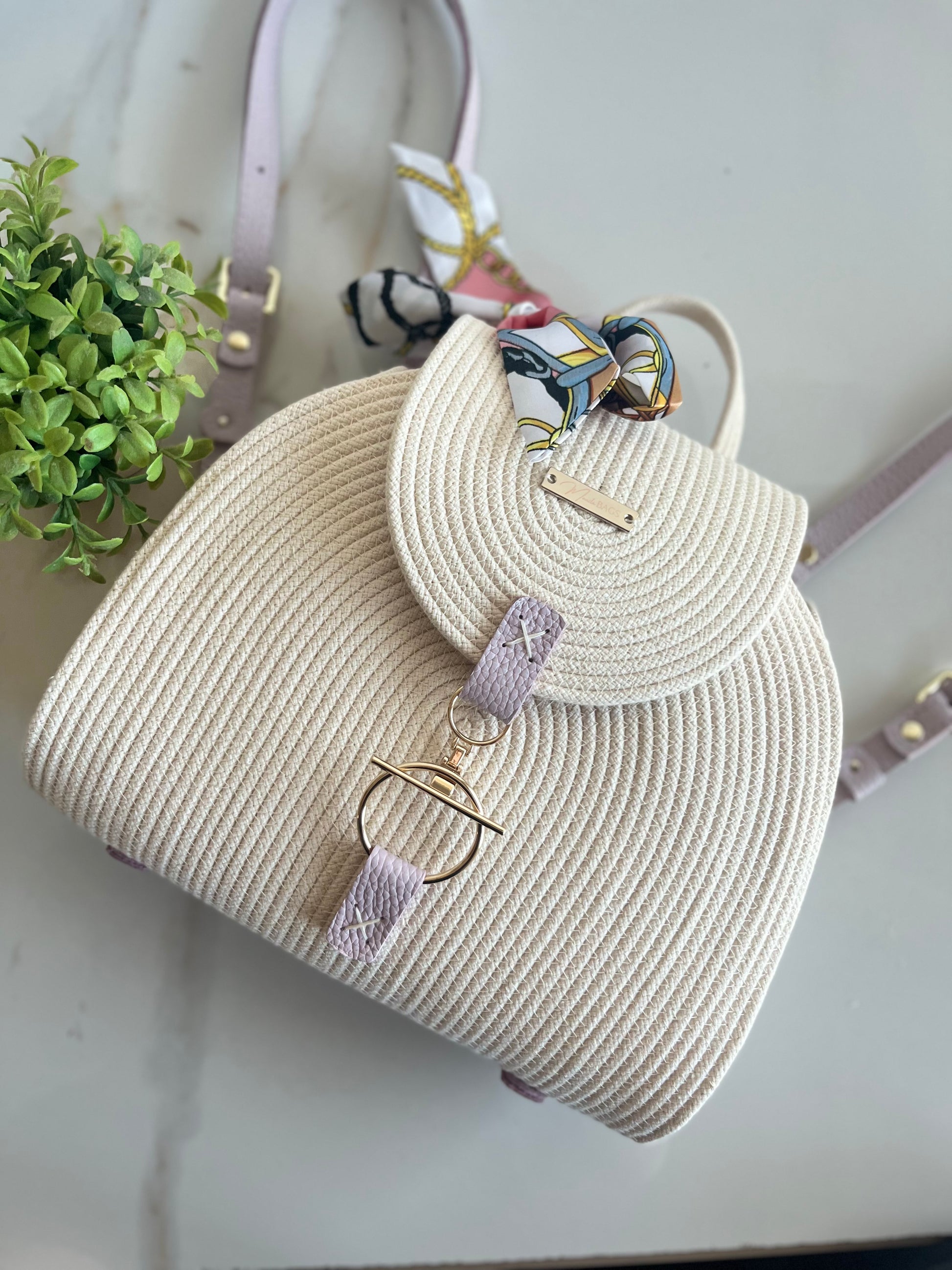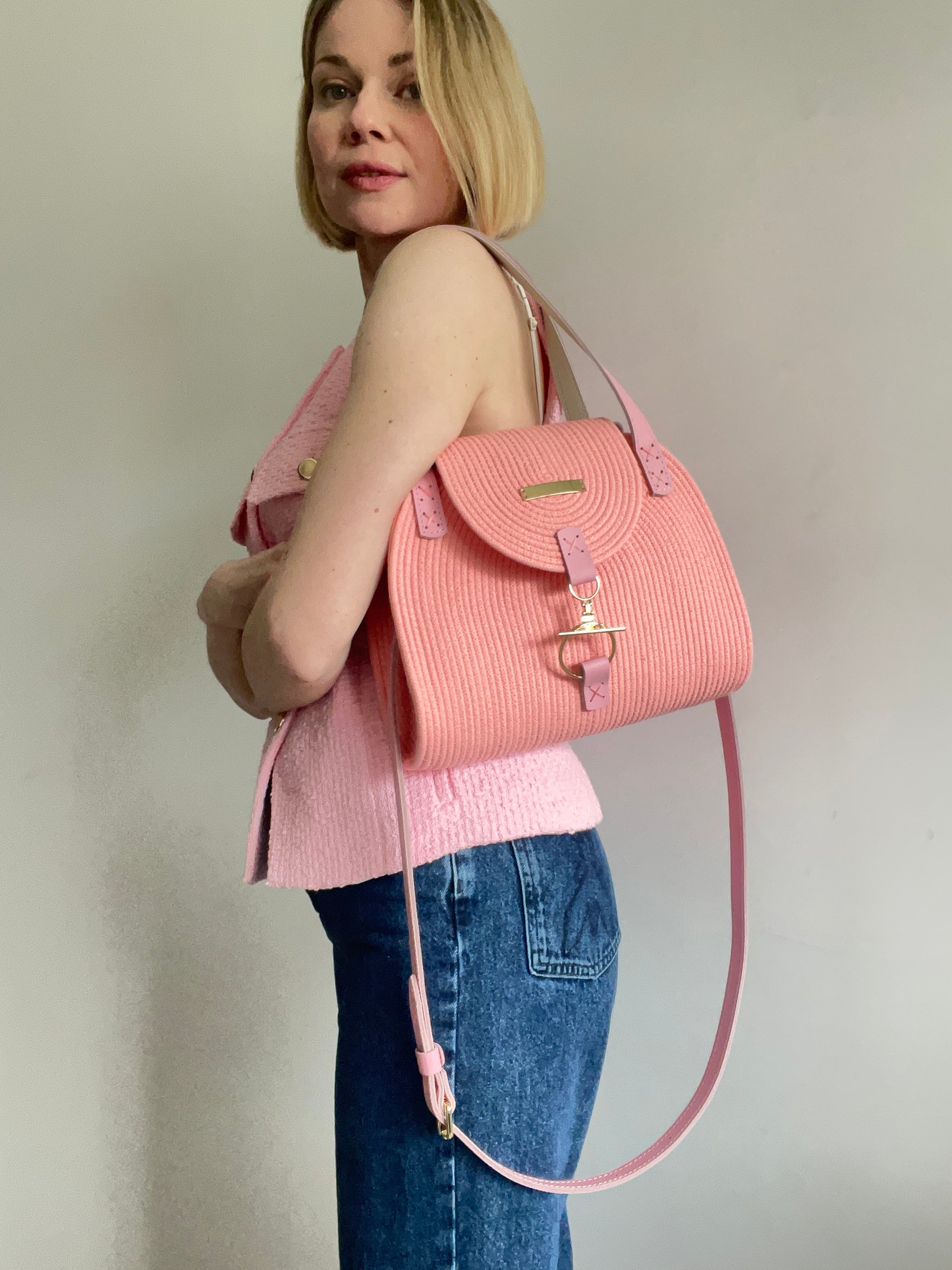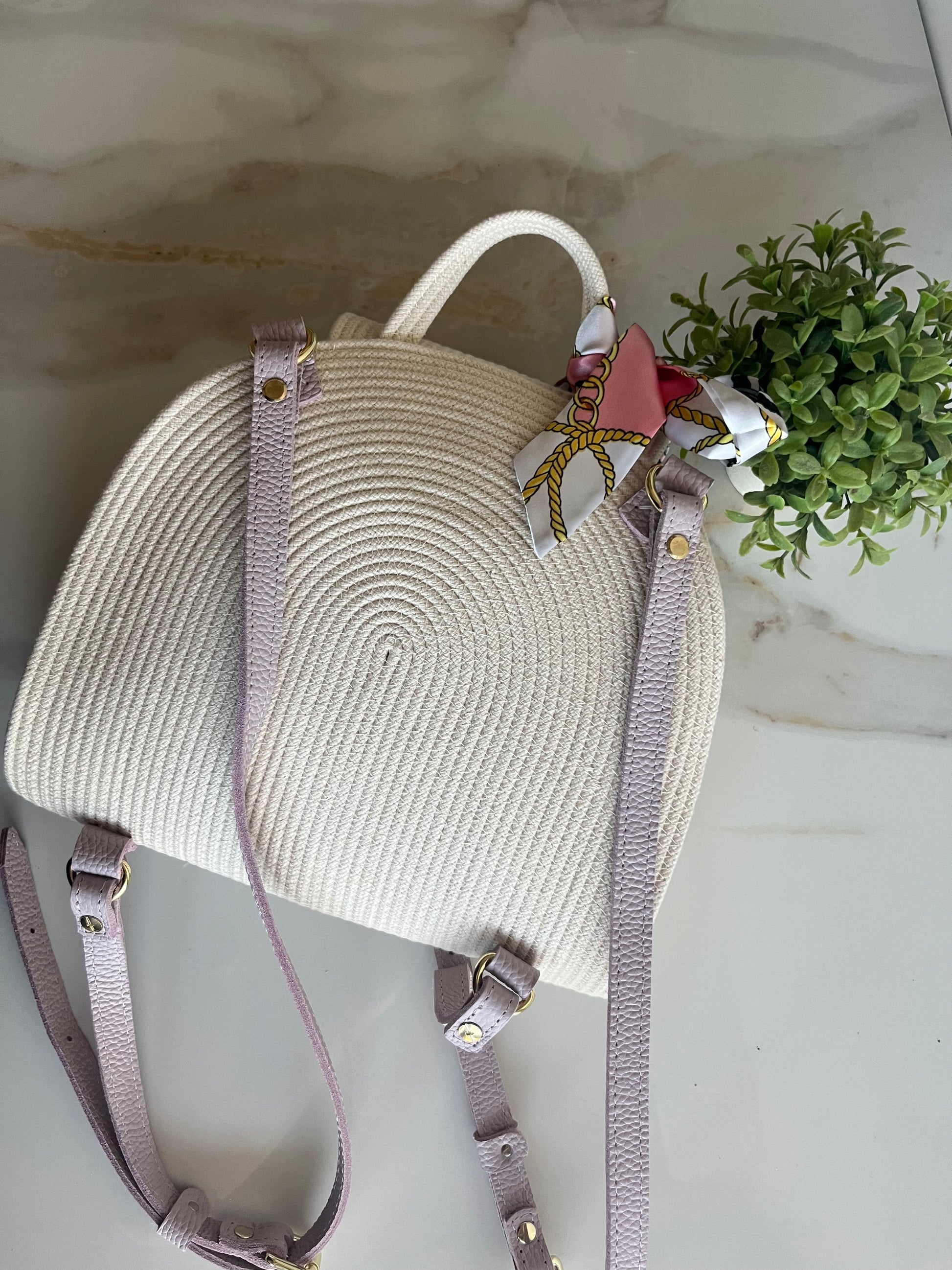 Realizzato a mano in corda di cotone di alta qualità, è arricchito da manici e tracolla in vera pelle.