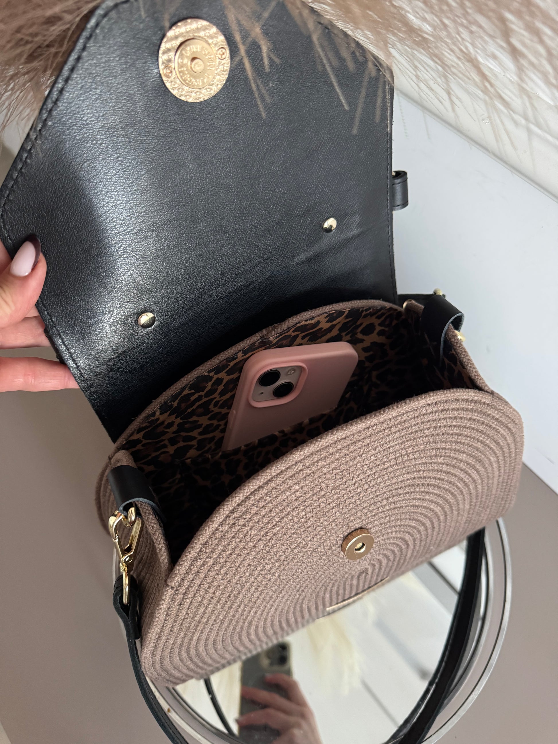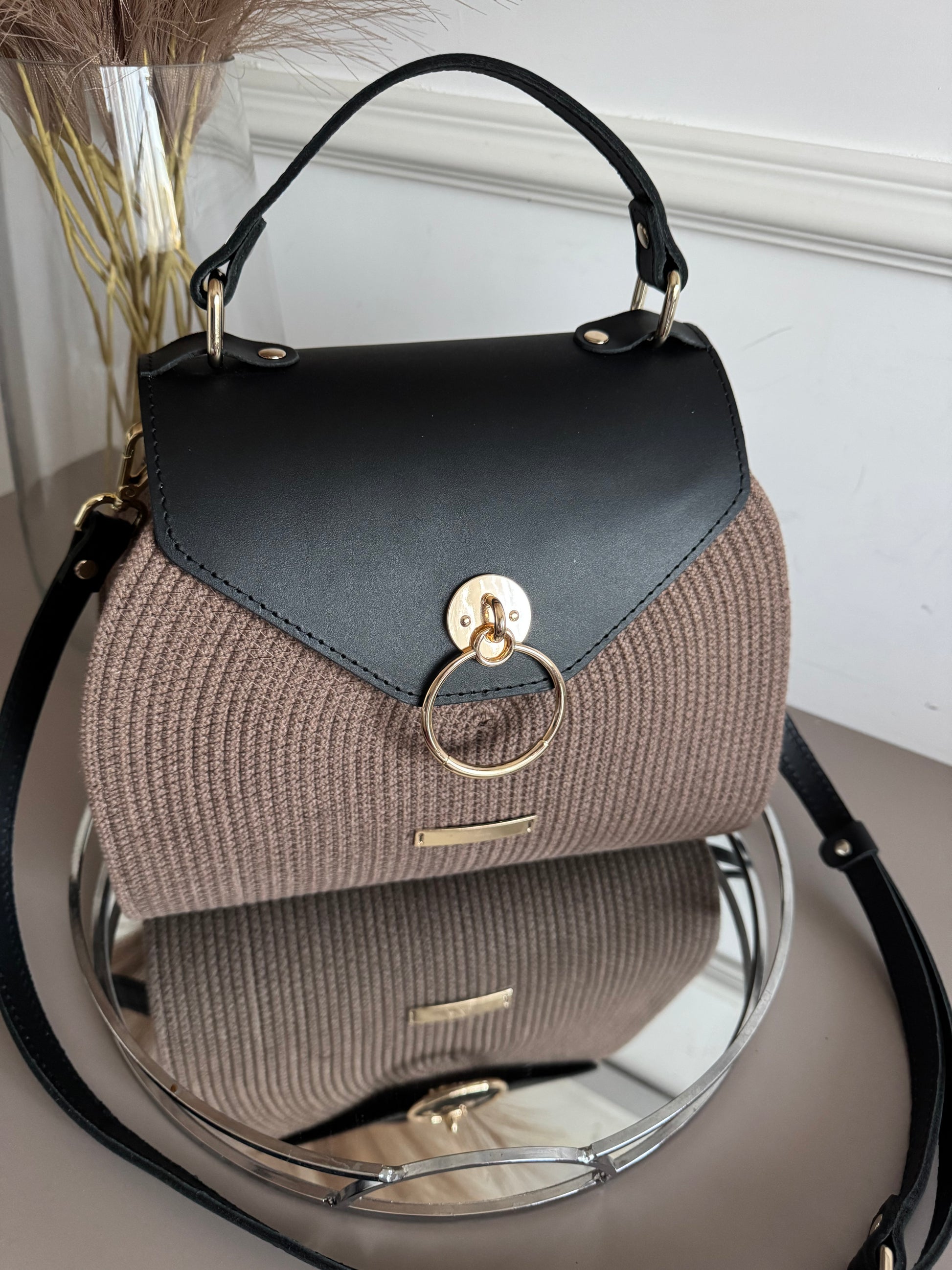 Realizzato a mano in corda di cotone di alta qualità, è arricchito da flap e tracolla in vera pelle.