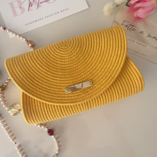 Fatta a mano in corda di cotone, con manico e tracolla in vera pelle, arricchiti da catene dorate decorative.